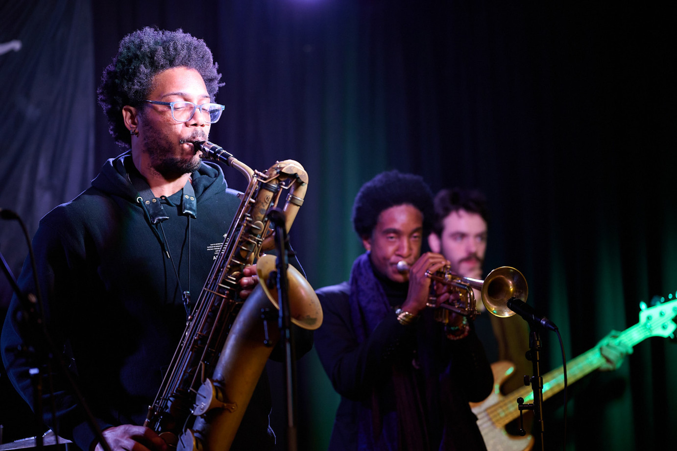 EN) This new trio, the latest project of Maxime Bender, brings together the Luxembourgish saxophonist with Manu Codjia on guitar and Stéphane Kerecki on bass in a veritable ode to the beauty of melody. The three musicians, who are not only accomplished but also extraordinarily talented, offer music of rare depth and intimacy. Their ability to convey powerful emotions invites the audience on an unforgettable and unique musical journey. The trio's exceptional complicity allows for improvisation that is both spontaneous and harmonious, creating a sound experience of incomparable richness.
