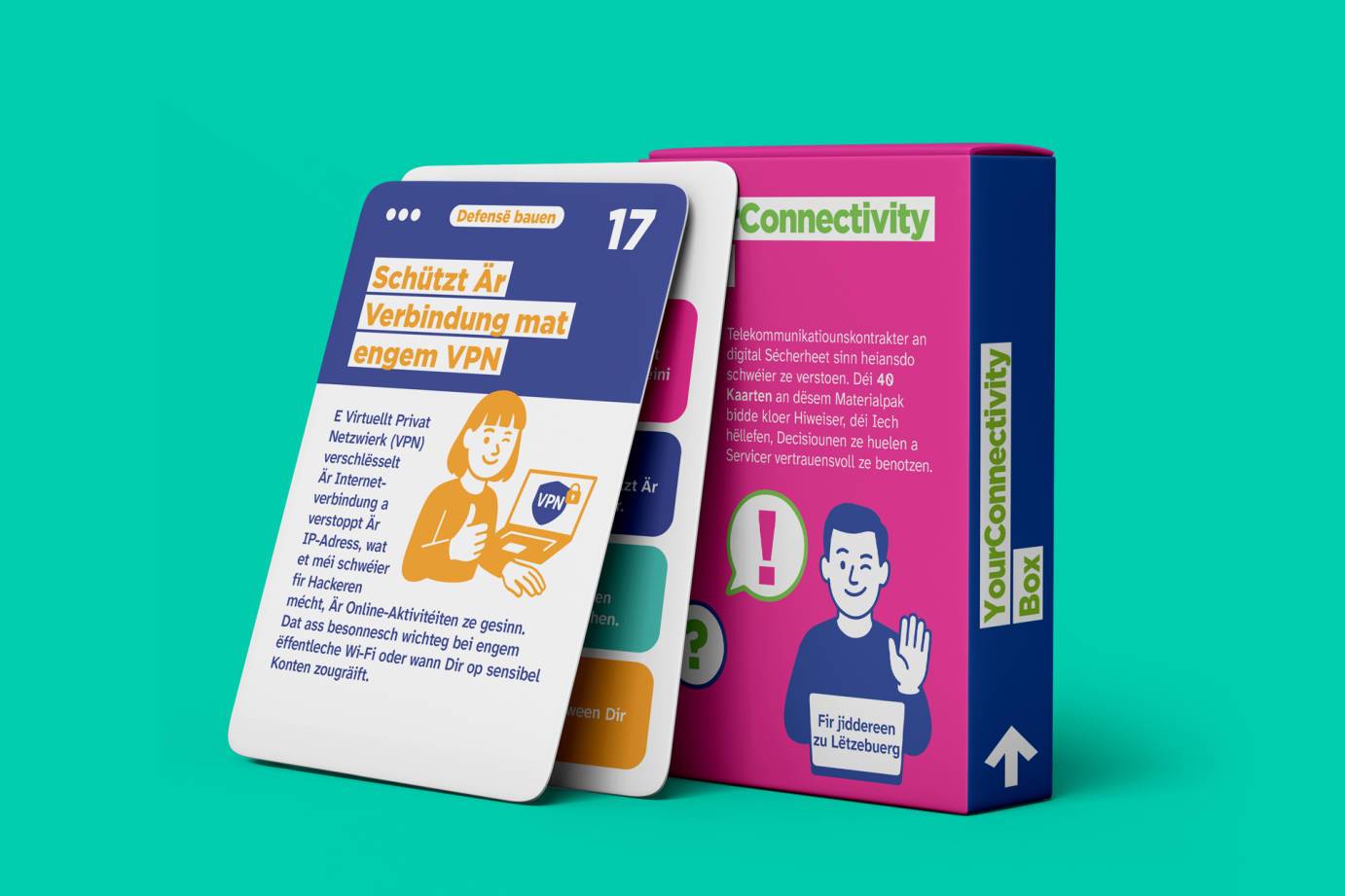 Entdecken Sie „YourConnectivity Box” – ein kostenloses Spiel mit 40 Lernkarten auf Französisch, Englisch oder Luxemburgisch, mit denen Sie die richtigen digitalen Reflexe entwickeln, sich vor Betrug schützen und Ihre Mobilfunk- und Internetverträge besser verstehen können.