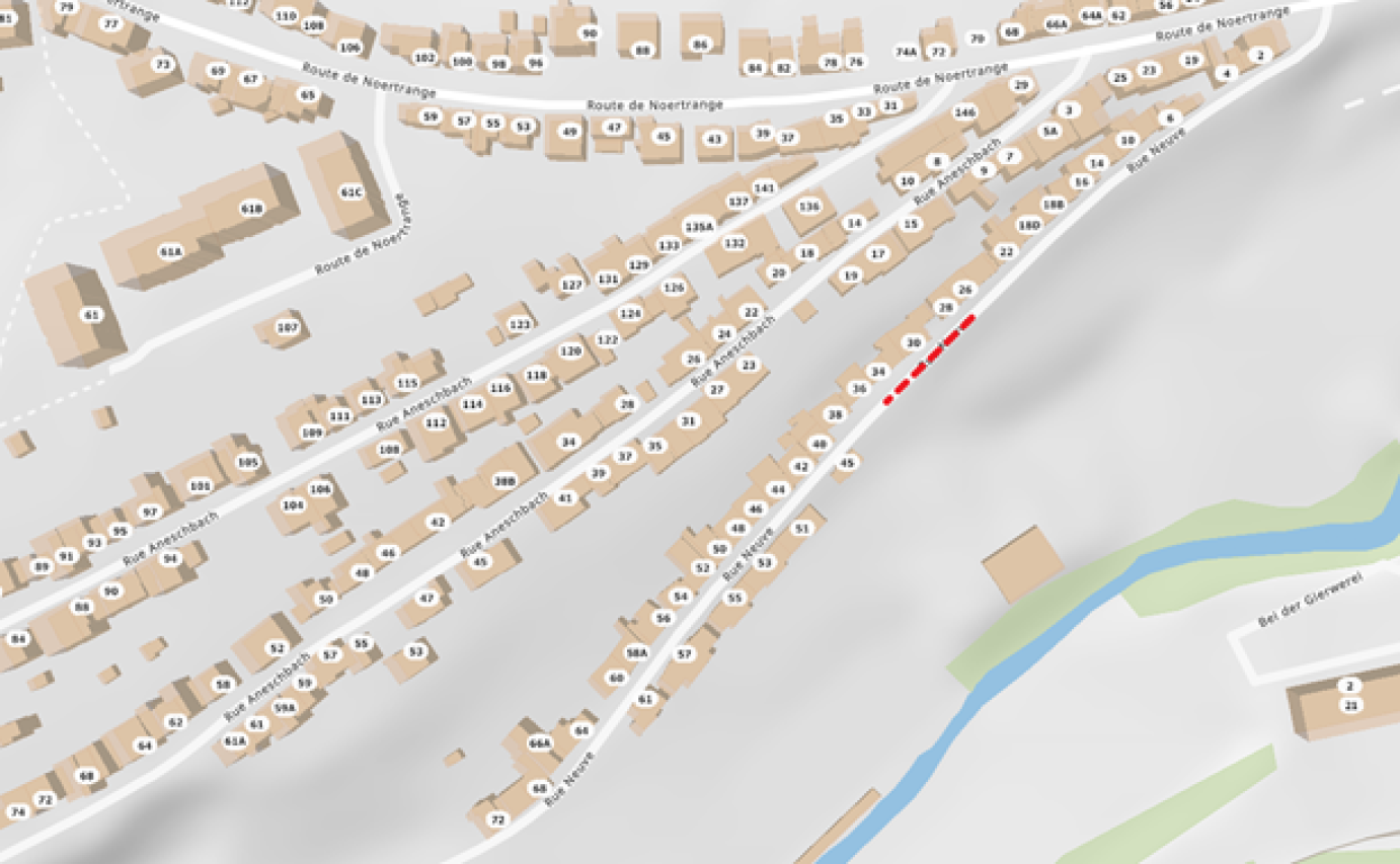 Les riverains des maisons numéros 28 à 34 sont priés d’enlever leurs voitures de la rue avant le début des travaux et d’utiliser les emplacements publics dans les environs. Pour la durée du chantier, l'accès à la rue Neuve pour les riverains se fait par la route de Winseler, respectivement par la route de Noertrange. Le stationnement sur les terrains du Fonds du Logement est strictement interdit. |