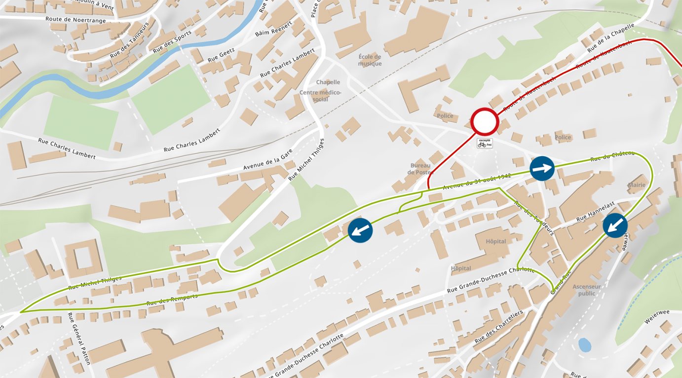 route de Kautenbach, avenue du 31 Août 1942, rue du Château, Grand-Rue (sens inversé), rue des Remparts (sens inversé)