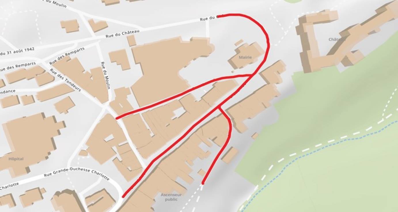 seront barrées à la circulation et interdit au stationnement : Grand-Rue, Weierwee, rue Hannelast et rue du Château Les riverains seront priés d’enlever leurs véhicules des rues concernées avant le début du barrage. Le Parking du Château sera fermé le 10 mai 2026. Le Parking couvert «Gemengeplaz» sera gratuit ce même jour. |